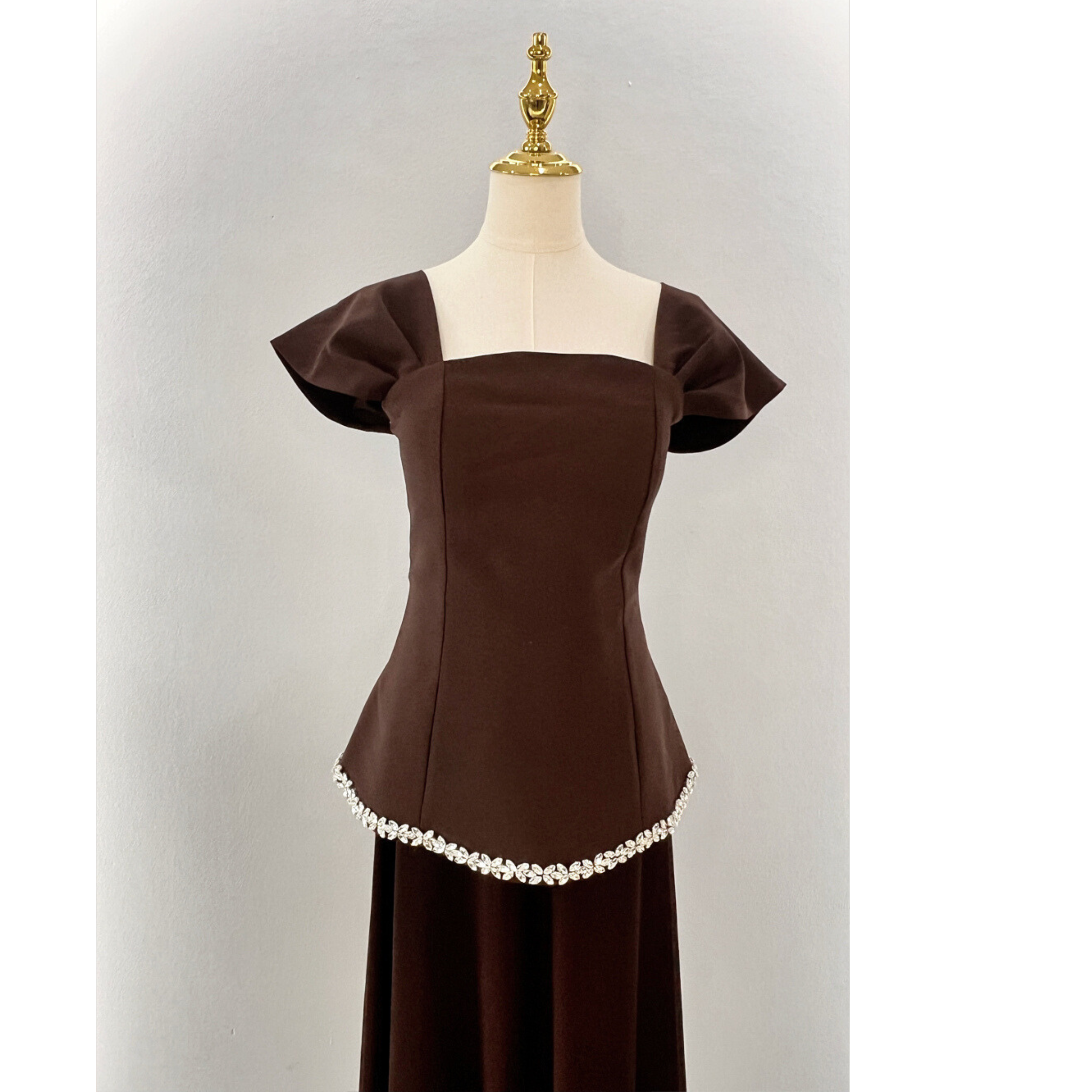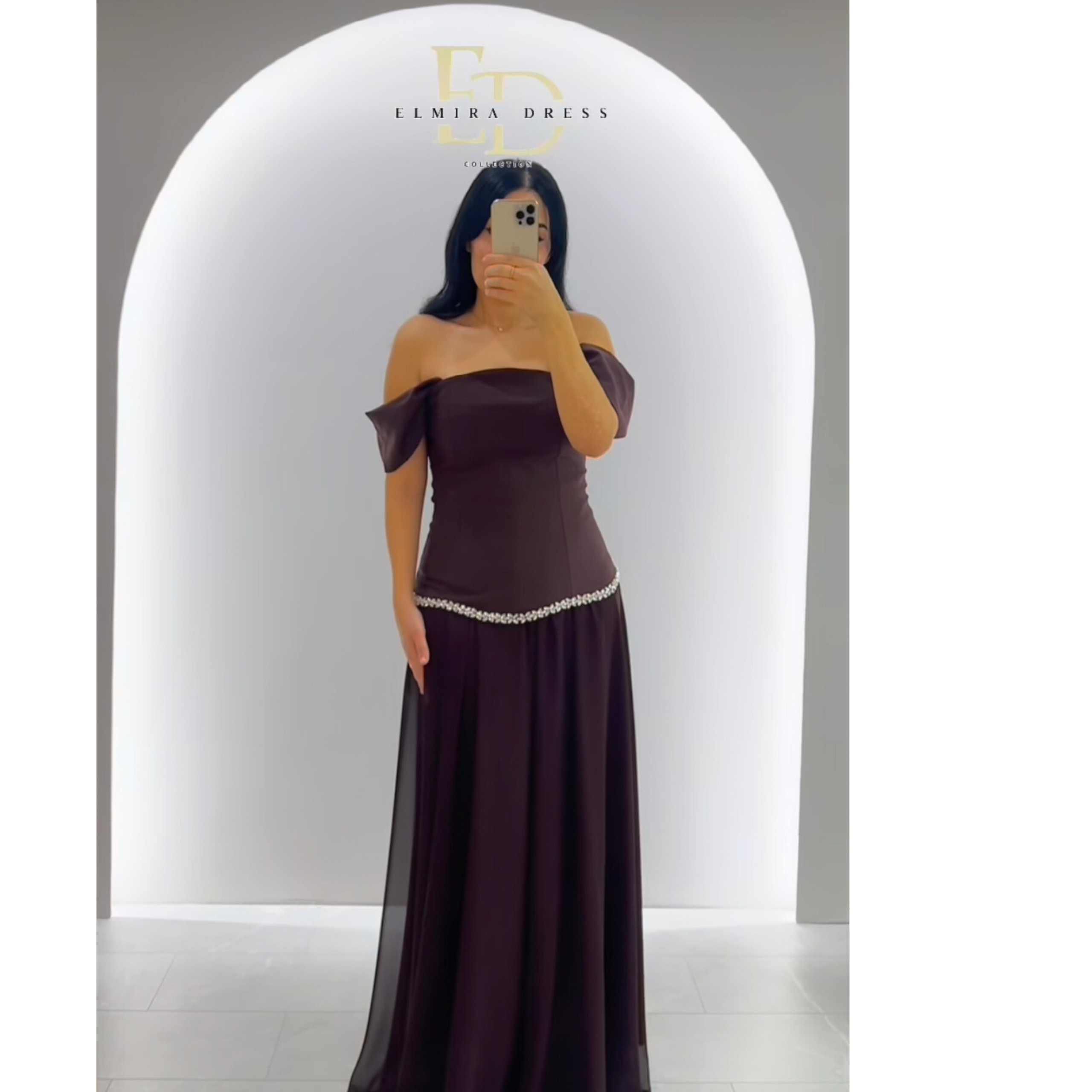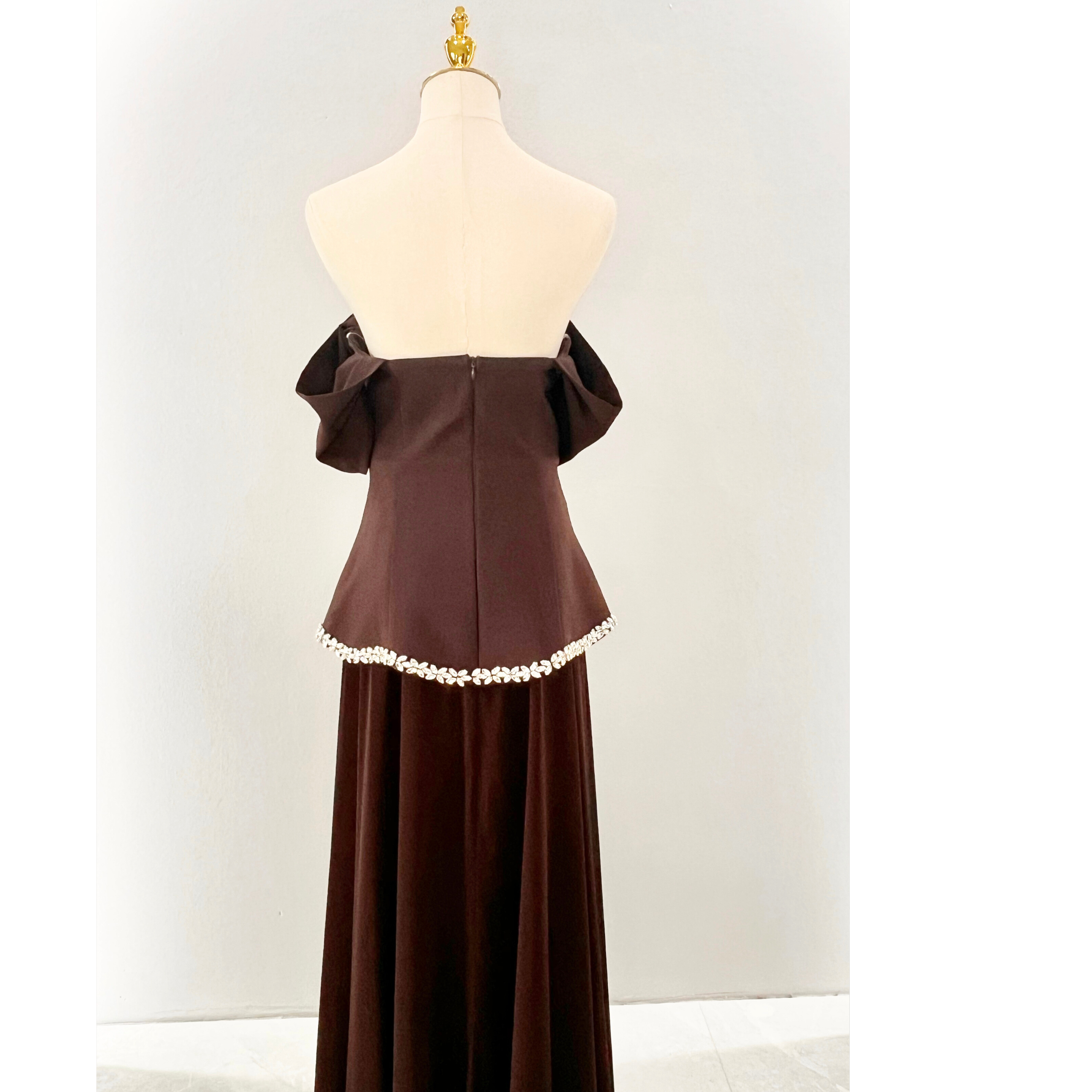 Dieses elegante Abendkleid begeistert mit seinem tiefen, edlen Braunton, der dem Design eine luxuriöse und zeitlose Ausstrahlung verleiht. Die feminine Silhouette und das figurschmeichelnde Oberteil setzen die Taille stilvoll in Szene und sorgen für einen eleganten Auftritt.