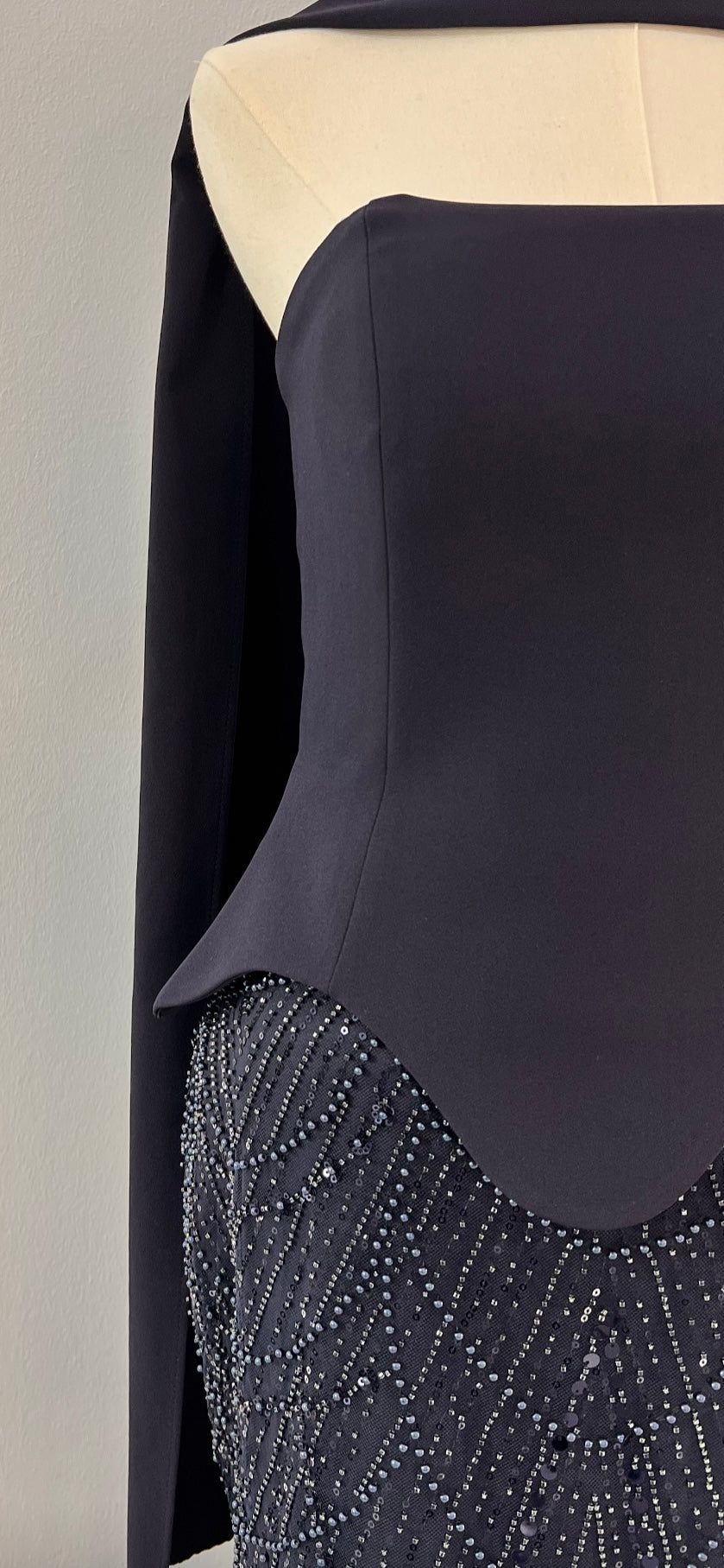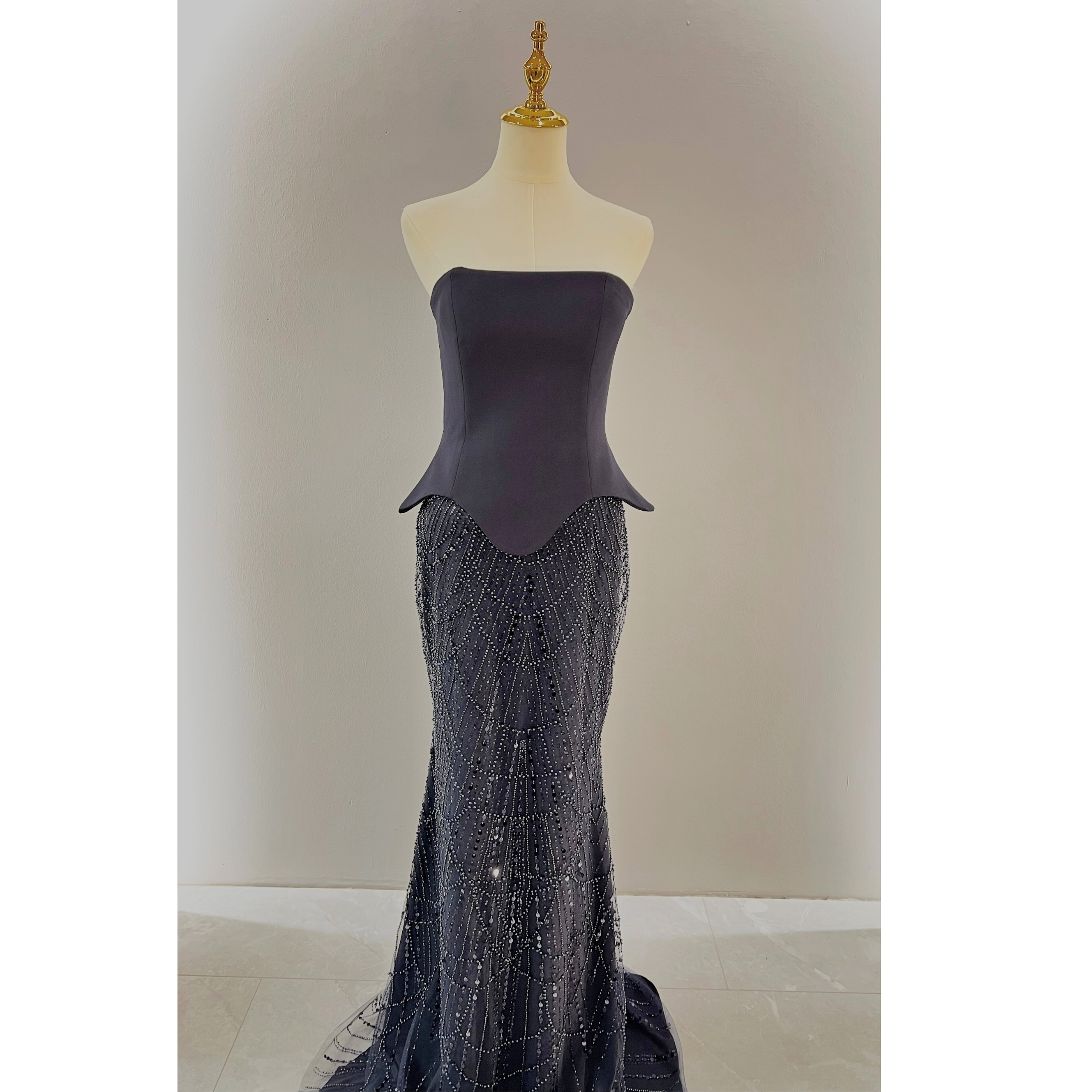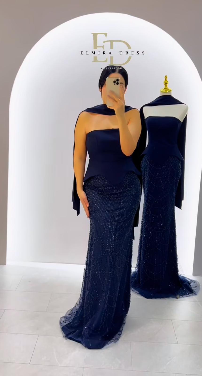 Dieses elegante Abendkleid begeistert mit seinem tiefen, edlen Dunkelblau, das dem Design eine zeitlose, luxuriöse Ausstrahlung verleiht. Die feminine Silhouette und das figurschmeichelnde Oberteil setzen die Taille stilvoll in Szene und sorgen für einen eleganten, selbstbewussten Auftritt.