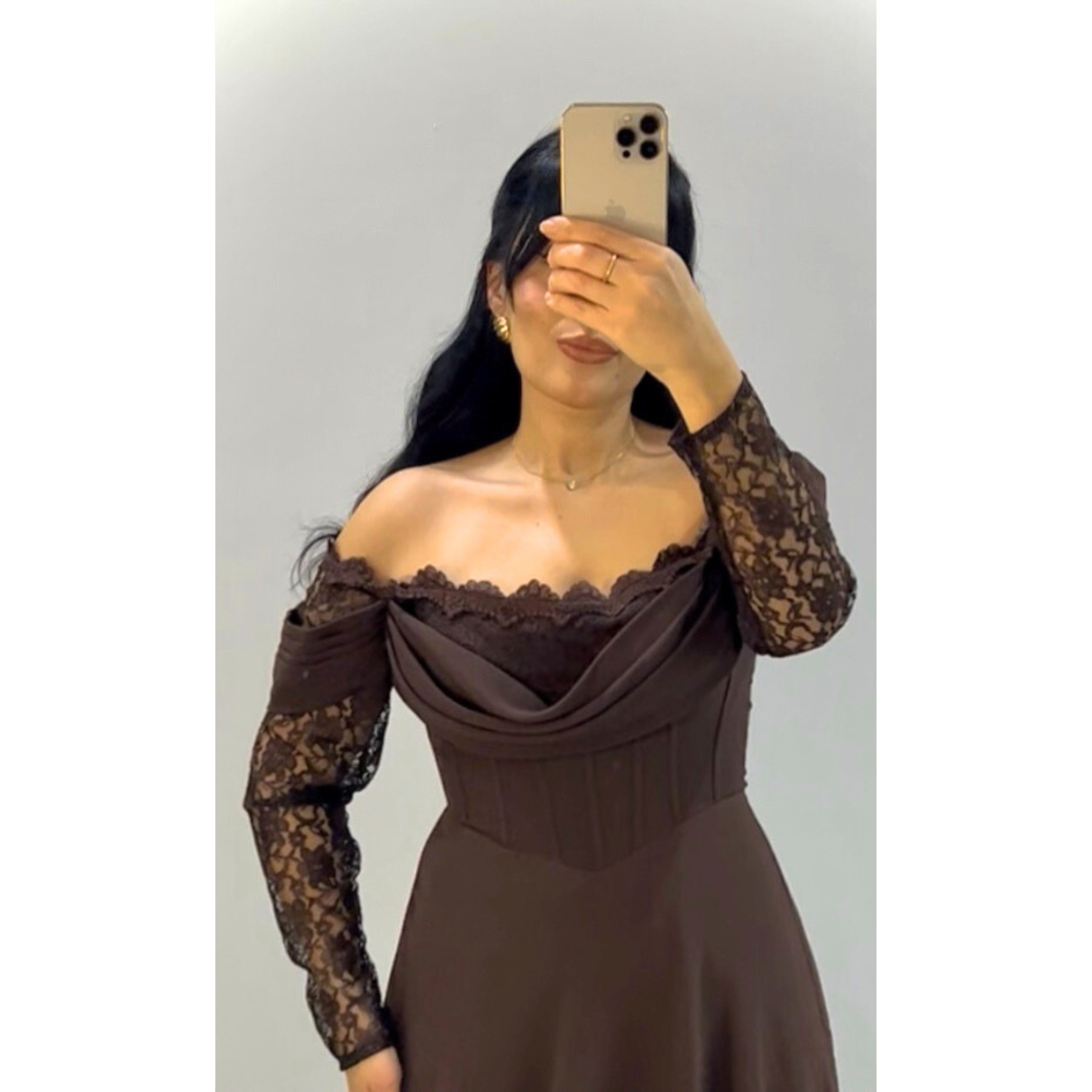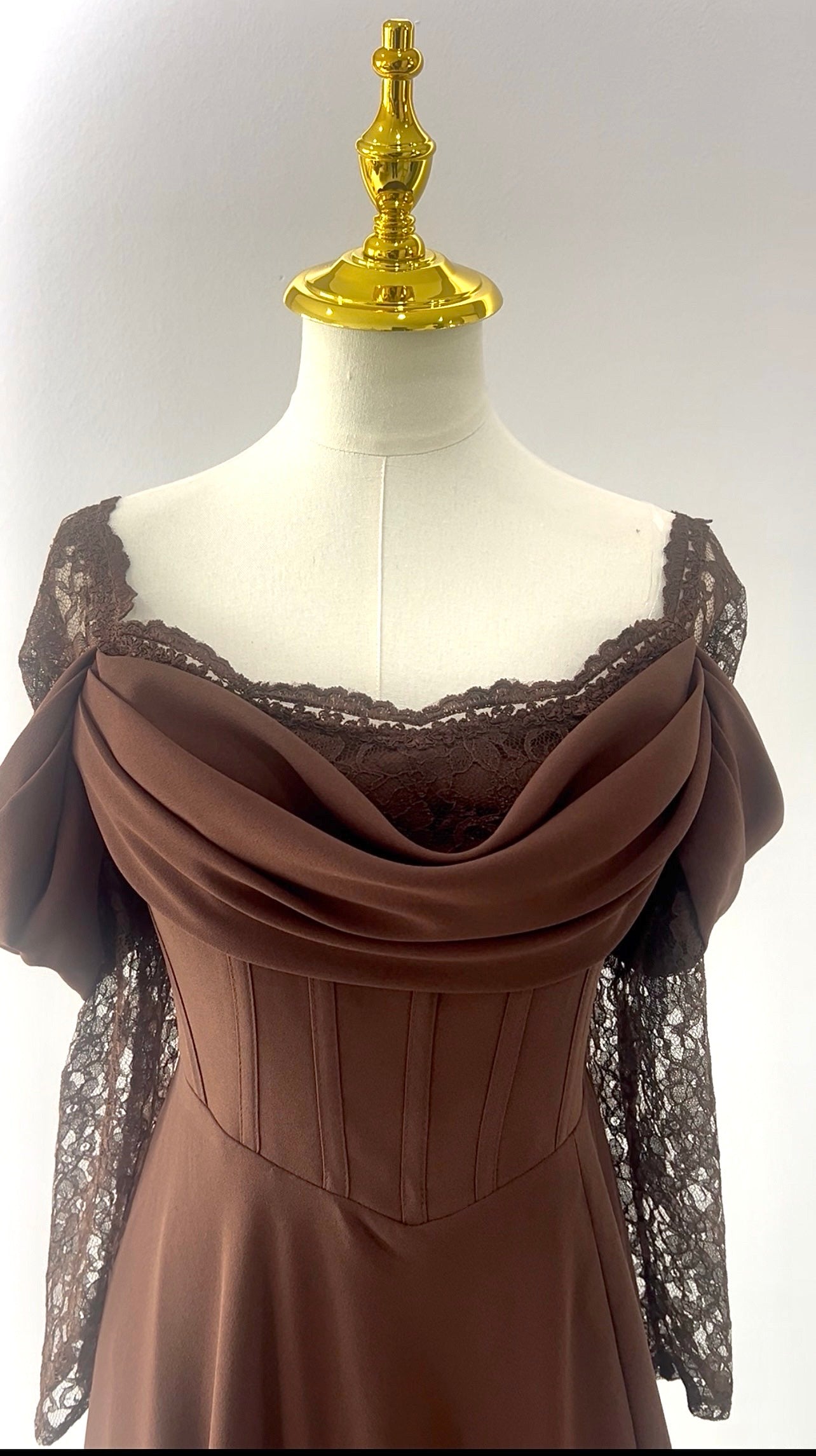 Dieses atemberaubende Abendkleid verzaubert mit seinem tiefen, warmen Mokka-Braun-Ton, der dem Design eine luxuriöse und zugleich sinnliche Ausstrahlung verleiht. Die formgebende Korsagen-Silhouette betont die Taille auf elegante Weise und zaubert eine wunderschön feminine Linie.